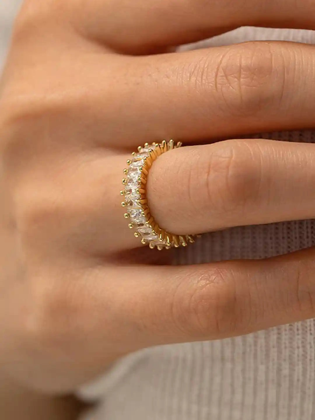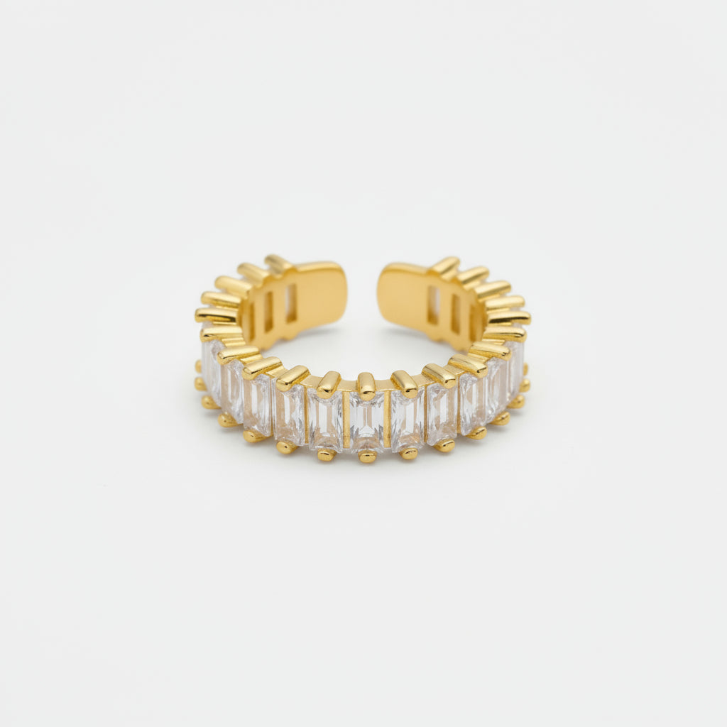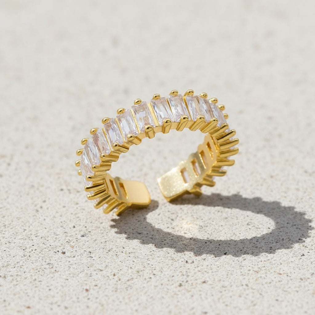 خاتم أنيق مطلي بالذهب عيار 18 ومصنوع من ستانلس ستيل عالي الجودة مقاوم للماء. يتميّز بتصميم مفتوح قابل للتعديل مرصّع بأحجار زركون لامعة تمنحه بريقاً يخطف الأنظار.