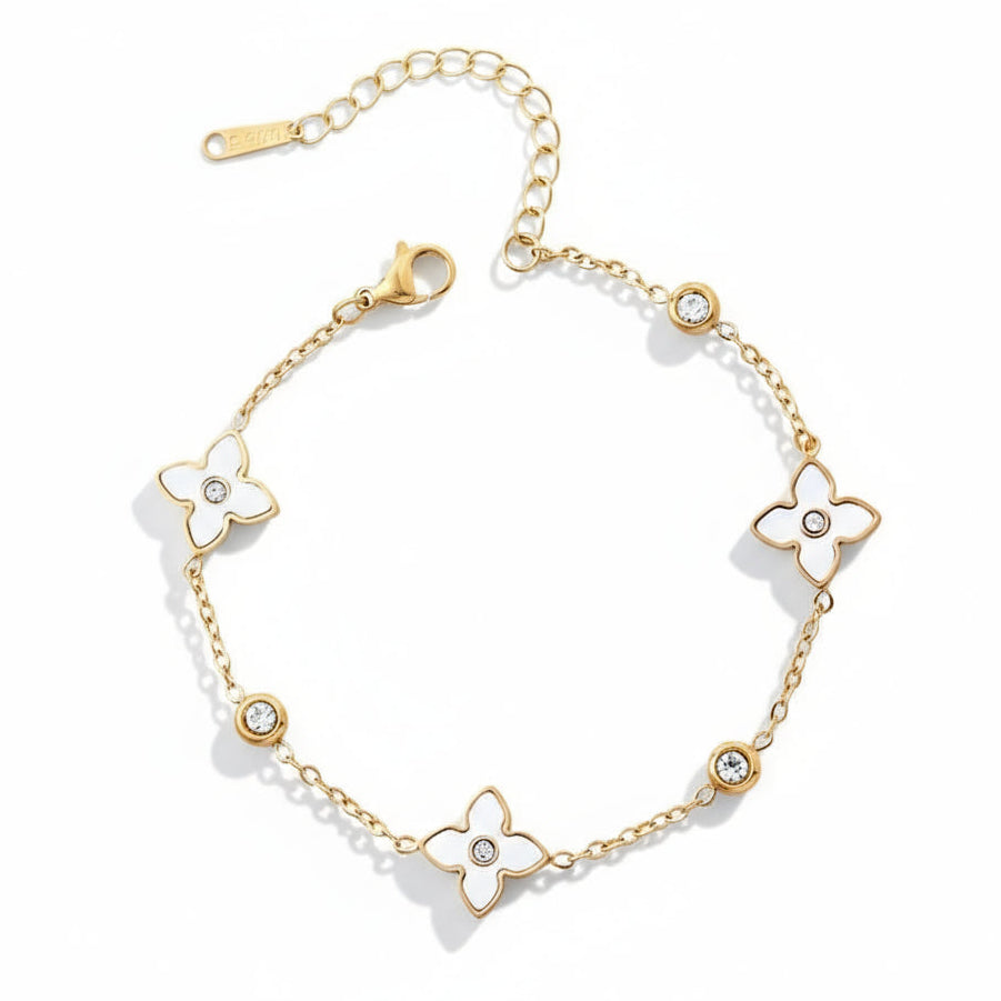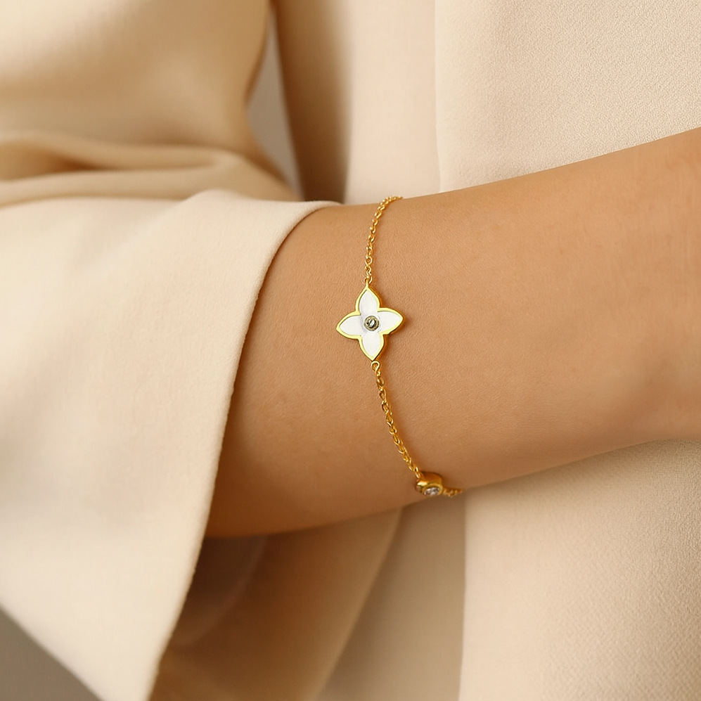 سوار مطلي بالذهب عيار 18 يتميّز بتصميم ناعم مزين بزخارف الزهرة البيضاء وأحجار الزركون اللامعة على سلسلة رفيعة قابلة للتعديل. يجمع بين البساطة والفخامة ليكون اللمسة المثالية لأي مناسبة.