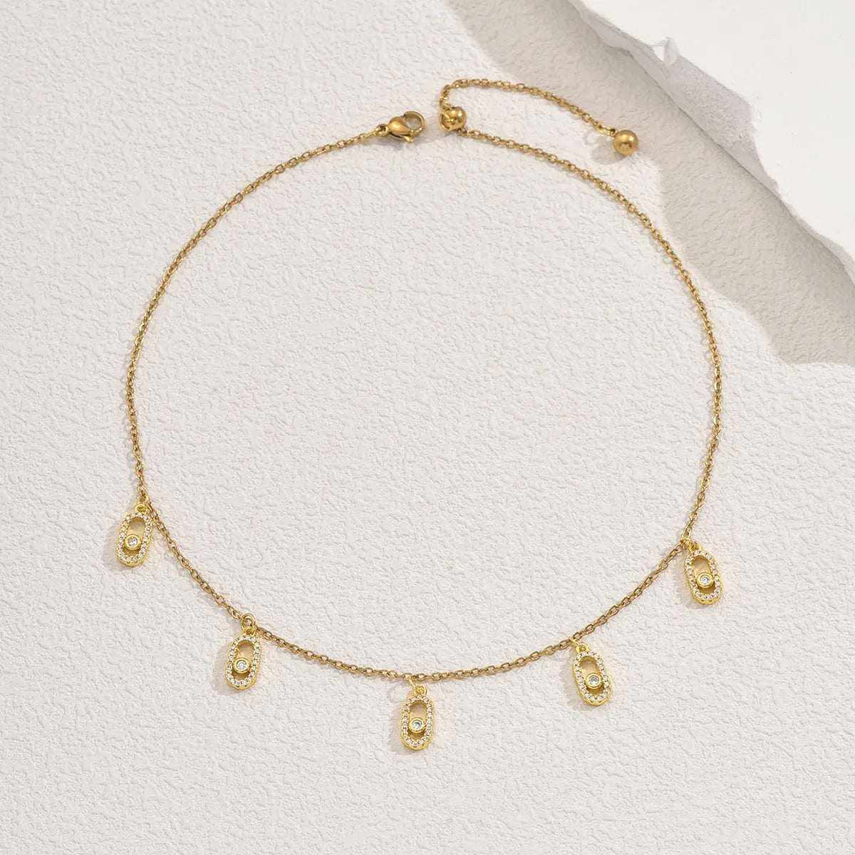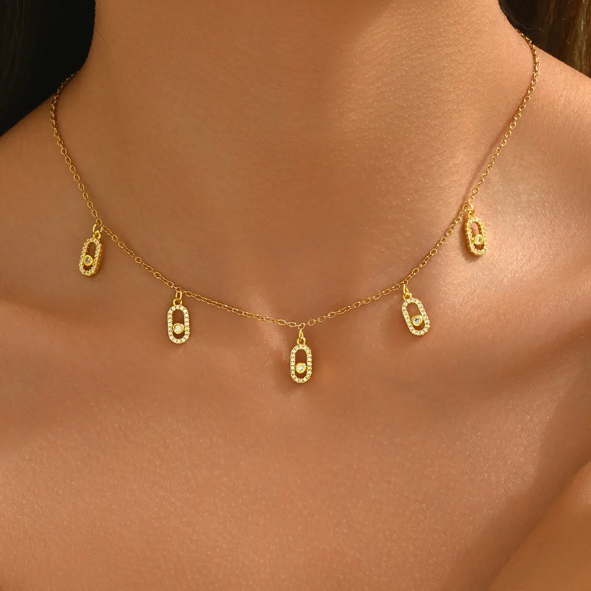 قلادة ناعمة بتصميم أنثوي راقٍ، مزينة بتعليقات مرصّعة بزركون لامع تمنحك لمسة فخامة.