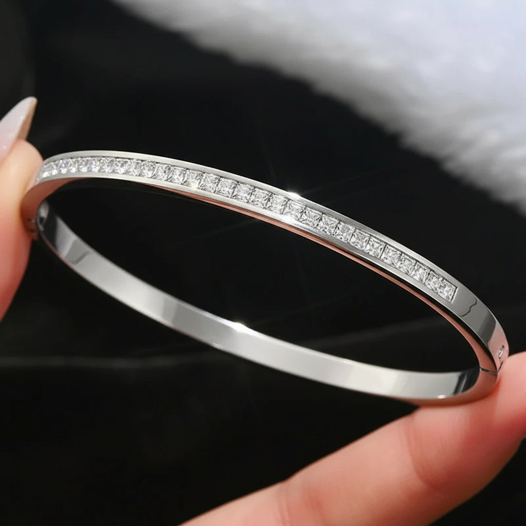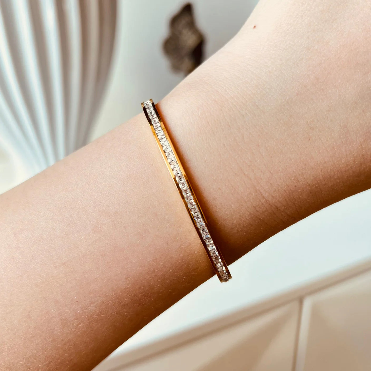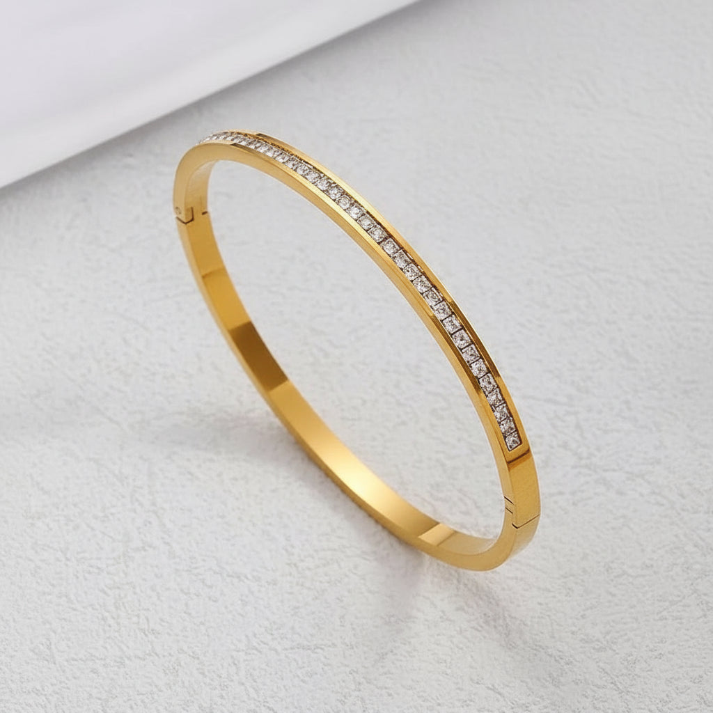 سوار مضاوي بتصميم عصري راقٍ، مصنوع من ستانلس ستيل متين ومطلي بذهب عيار 18. قطعة تضيف لمسة أنثوية لامعة لإطلالتك وتناسب كل يوم وكل مناسبة.